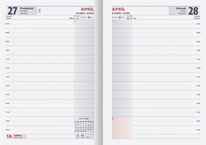 Denný diár s čiernou matnou obálkou s bohatým obsahom. Kvalitný diár s hodinovým delením obsahuje slovenské a české kalendárium, anglický preklad mesiacov a dní, informácie o štátnych sviatkoch susediacich krajín EÚ, prehľadný a plánovací kalendár, školské prázdniny, prehľad dôležitých inštitúcií, adresár. Ponúka dostatočný priestor pre písanie poznámok a pripomienok.