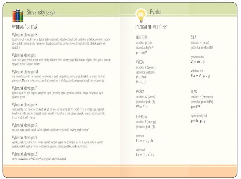 - obsahuje aj termíny školských prázdnin a užitočné informácie do školy – matematika, chémia, fyzika, slovenský jazyk, anglický jazyk