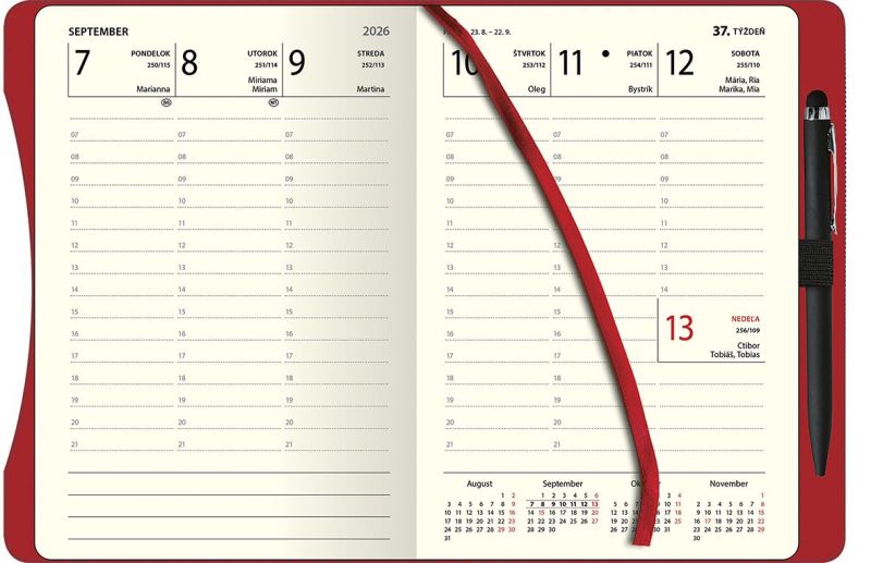 Týždenný diár s praktickým vrecúškom spolu s čiernym elegantným perom patria medzi obľúbené diáre, ktoré disponujú s dostatočným priestorom na poznámky v riadkoch.