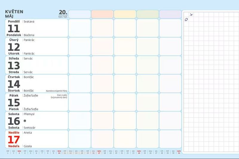 - kalendárium: české/slovenské týždenné riadkové
