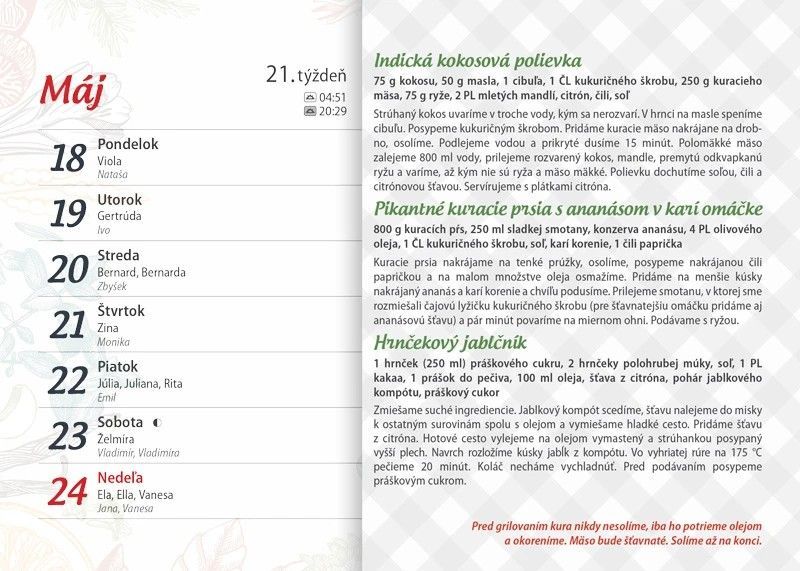 Milujete tradičnú slovenskú kuchyňu, ale radi vyskúšate aj niečo nové? Inšpirujte sa nástenným dvojtýždňovým kalendárom s obrázkami a receptami jedál a praktickými radami do kuchyne. Obsahuje slovenské a české kalendárium a...