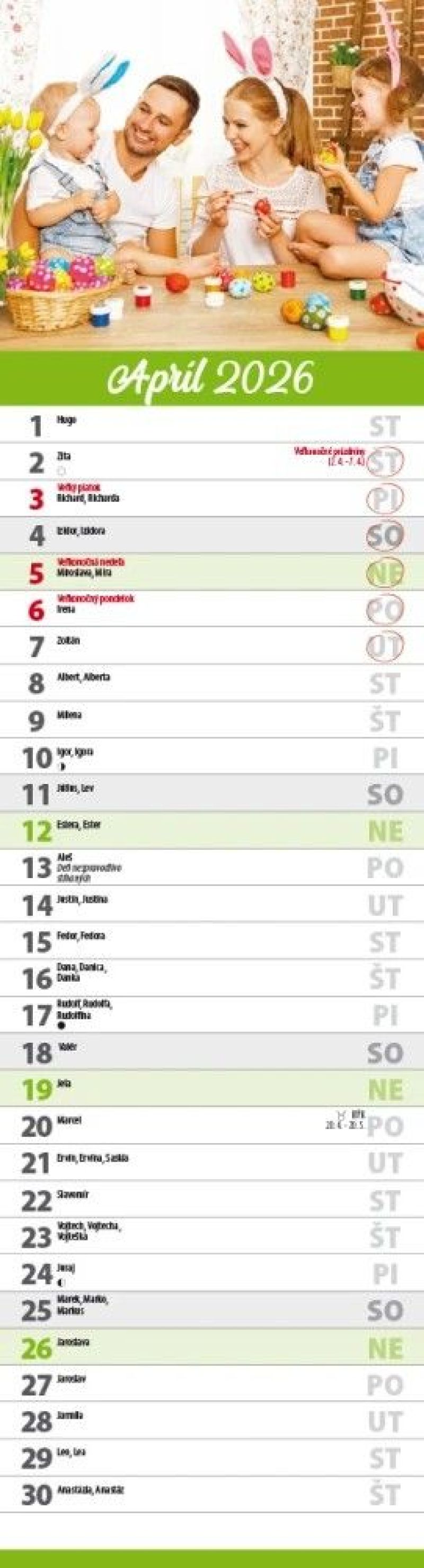 Rodinný kalendár pre zábudlivcov s pripomienkami najvýznamnejších sviatkov týkajúcich sa rodiny. Prehľadné mesačné kalendárium s českými a slovenskými menami, štátnymi sviatkami aj v okolitých krajinách, s prehľadom školských prázdnin, znameniami zverokruhu a fázami mesiaca doplnené o priestor na poznámky.