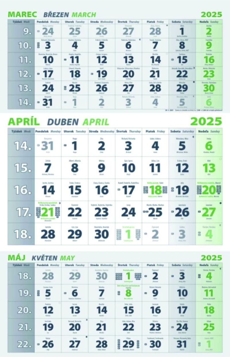 Má posuvné okienko pre lepšiu orientáciu v mesiaci, kalendárium so slovenskými a českými menami a sviatkami v okolitých krajinách EÚ. Kalendár je vh...