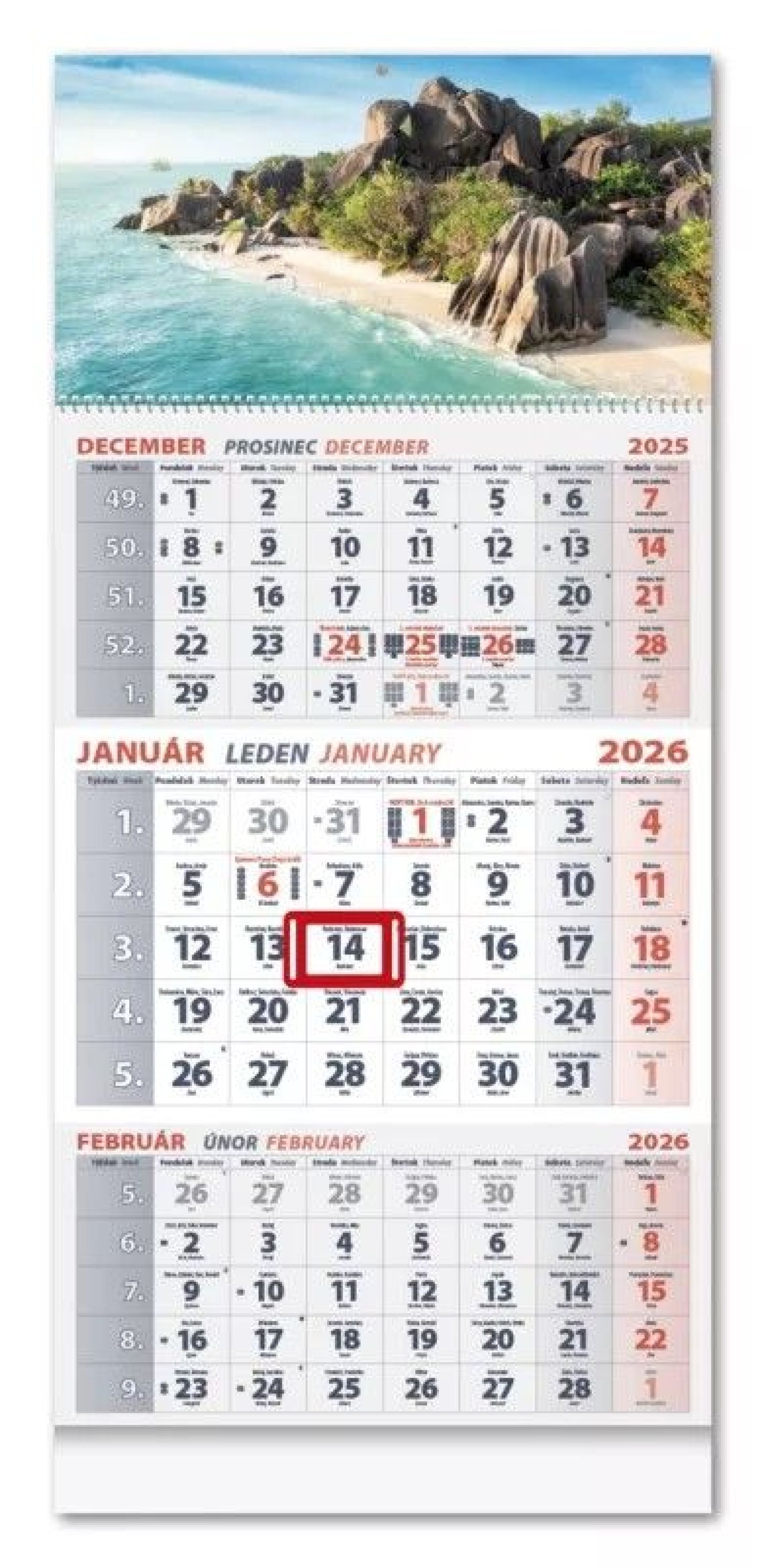 Má posuvné okienko pre lepšiu orientáciu v mesiaci, kalendárium so slovenskými a českými menami a sviatkami v okolitých krajinách EÚ. Kalendár je vhodný aj pre organizácie a spoločnosti. Ponúka možnosť umiestnenia vlastnej grafiky namiesto obrázku na vrchný lash, či potlač podložky.