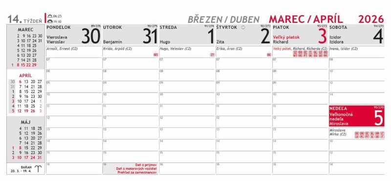 Praktický plánovací kalendár s prehľadom najbližších mesiacov na ľavej strane. Dostatok miesta na plánovanie celého týždňa.