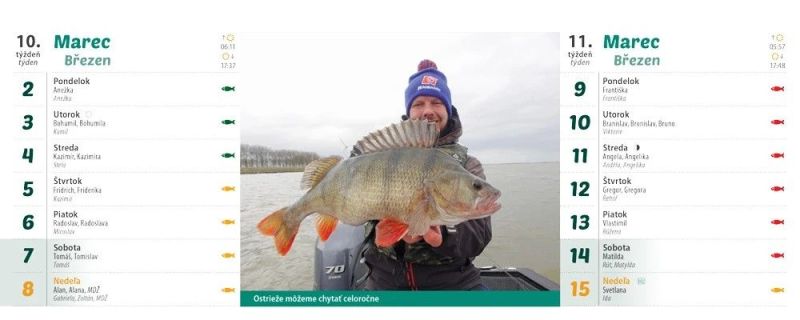 Praktický rybársky stolový kalendár s aktivitou rýb na celý rok, so zákonnými lovnými mierami rýb a časom individuálnej ochrany. Obsahuje prehľad celoročne chránených rýb a denný čas lovu rýb podľa typov vôd. 28 reálnych fotografií úlovkov z našich revírov.