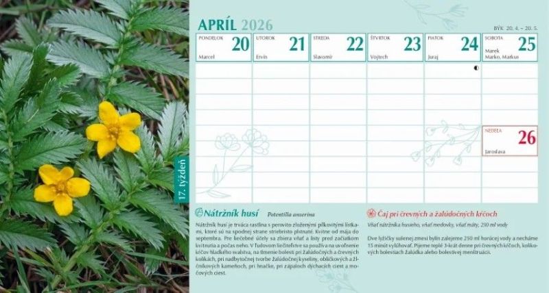 V tomto kalendári nájdete množstvo receptov na prírodné liečivá. Kalendár má riadkové radenie dní a slovenské menné kalendárium.