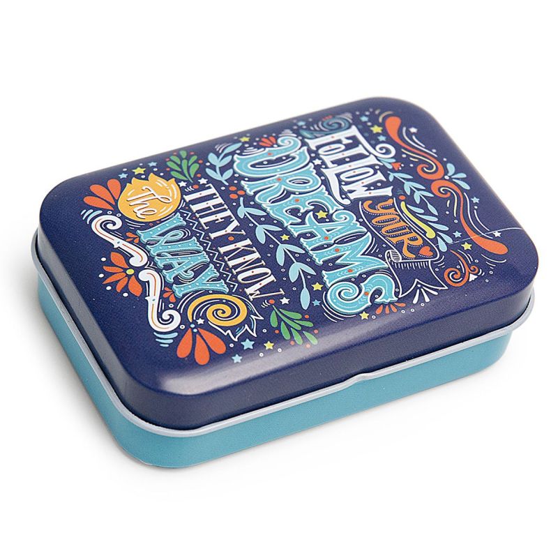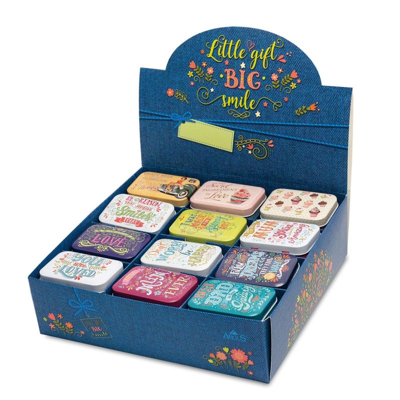 Plechová krabička s odklápacím vekom na pánt a potlačou. Vhodná pre rôzne drobnosti v domácnosti ale aj ako malý darček.