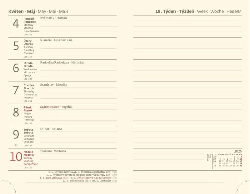 Diár obsahuje: osobné údaje, plánovač dovolenky (mesačný prehľad), plánovací kalendár, medzinárodné sviatky, ročný výhľad, týždenný layout, adresár