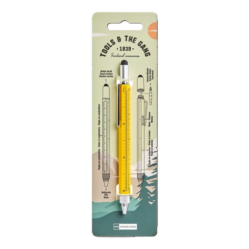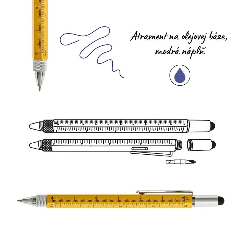 - okrem guľôčkového pera obsahuje pravítko v centimetroch i palcoch, vodováhu, plochý a krížový skrutkovač a dotykový stylus na smartfóny a tablety