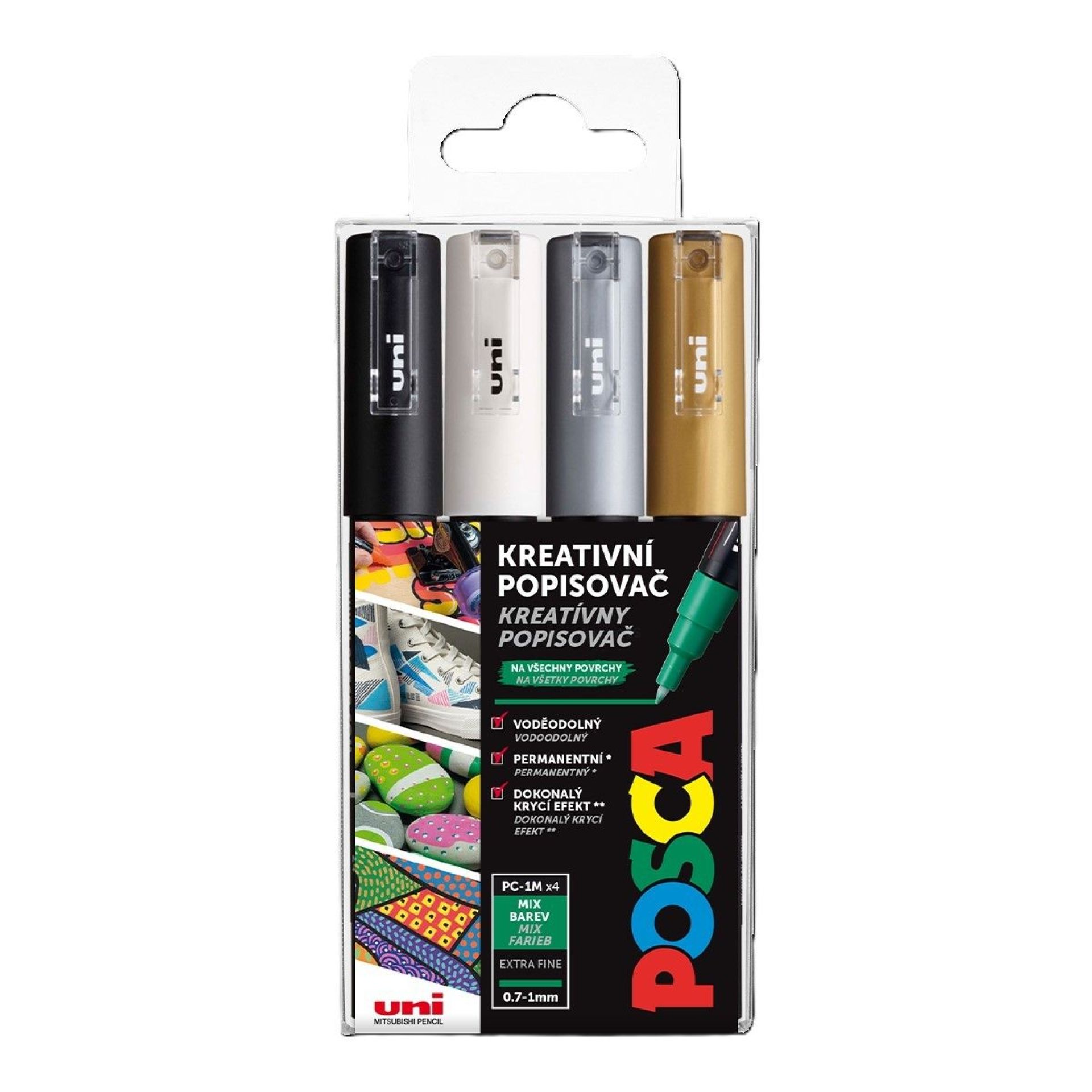Súprava obsahuje 4 kusy popisovačov PC-1M v bielej, čiernej, striebornej a zlatej farbe
