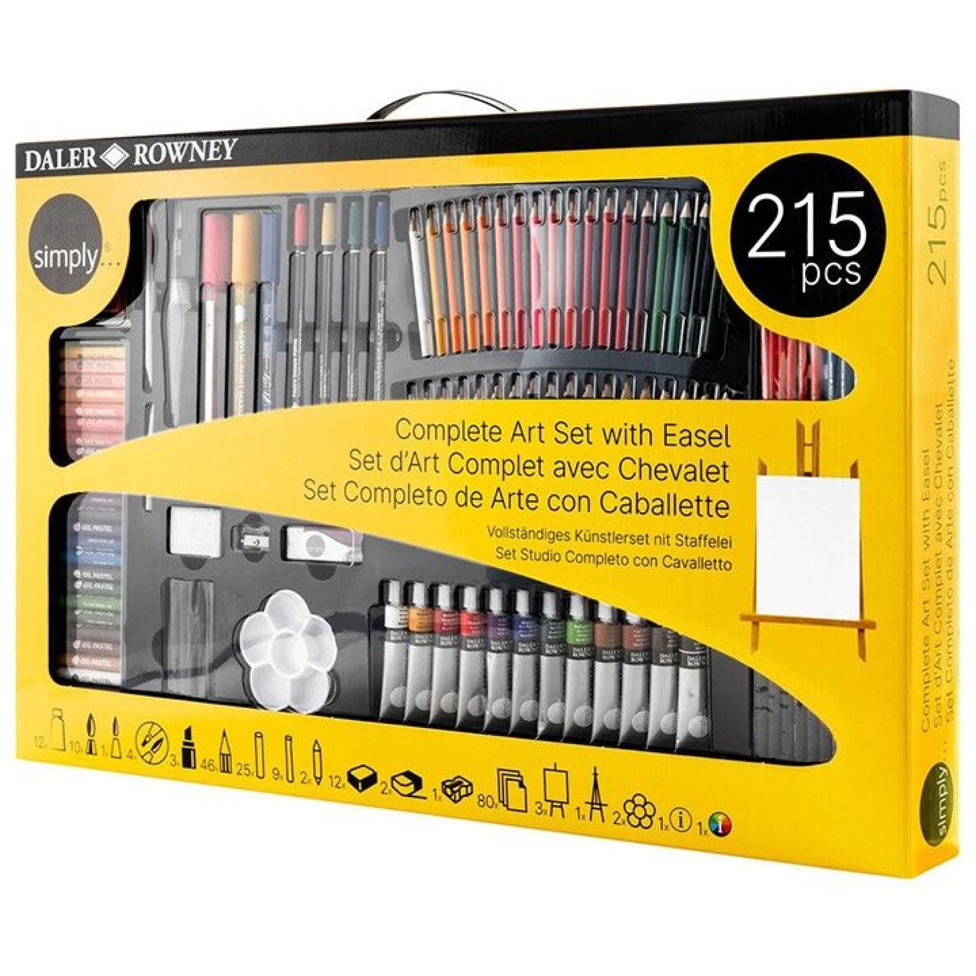 Set zahŕňa maliarsky stojan, plátna, široký výber kresliacich a maľovacích pomôcok – štetce, pastelky, fixky, akvarelové a akrylové farby, uhlíky, papiere a mnoho ďalšieho. Celkovo až 215 kusov výtvarného materiálu, prehľadne uložených v praktickom kufríku s úchytom, čo zaručuje jednoduché prenášanie. Táto sada je skvelá na školské projekty, domáce ateliéry, darčeky aj každodenné kreslenie a maľovanie.