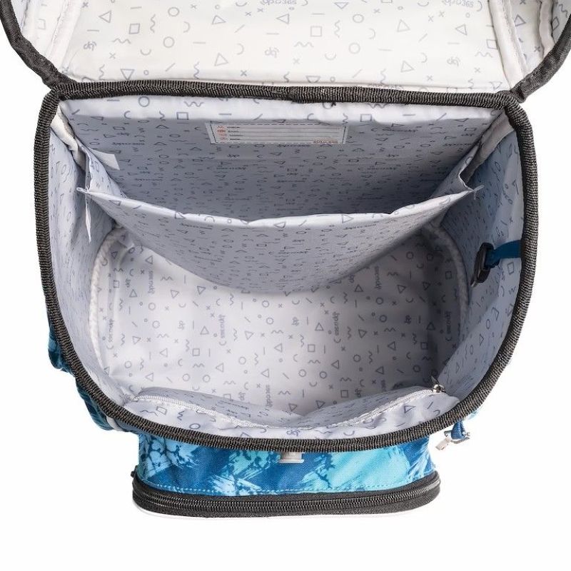 VNÚTORNÉ USPORIADANIE – priestranná hlavná vnútorná komora je rozdelená látkou na dve priehradky na uloženie boxu na zošity, či kníh. Súčasťou hlavnej komory je aj vrecko na uloženie drobností, odopínateľný krúžok na kľúč a štítok na meno a adresu. Vo vrchnej časti aktovky sa nachádza priehľadné púzdro na rozvrh hodín