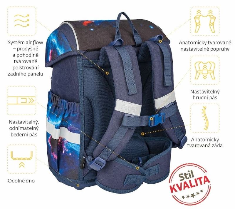 POHODLIE – výškovo nastaviteľný hrudný a teraz aj odnímateľný bedrový pás s kvalitnou prackou zaistí pohodlné nosenie aktovky na chrbte dieťaťa i správne rozloženie váhy