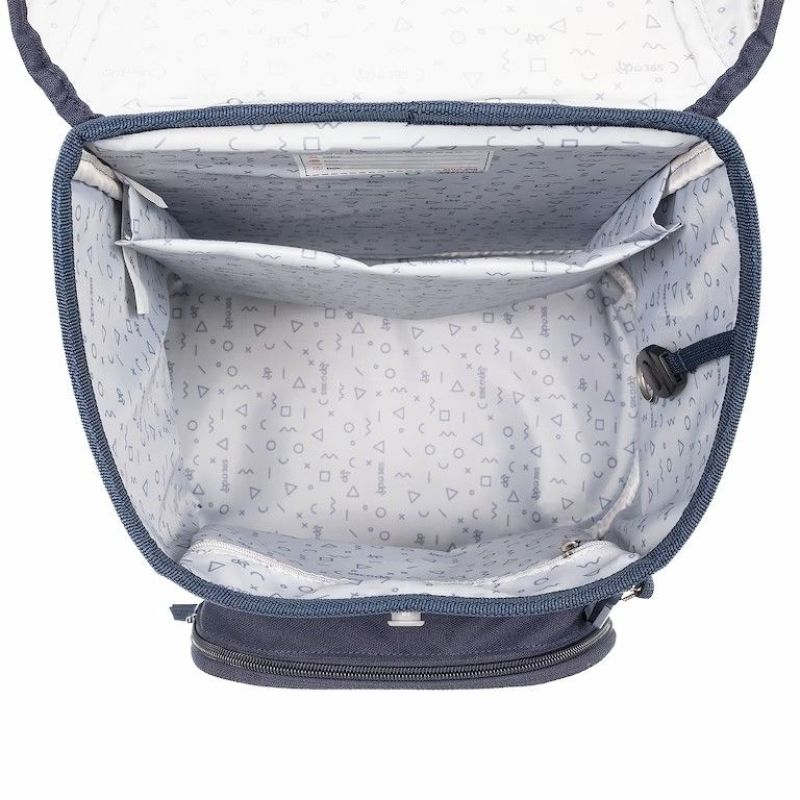 VNÚTORNÉ USPORIADANIE – priestranná hlavná vnútorná komora je rozdelená látkou na dve priehradky na uloženie boxu na zošity, či kníh. Súčasťou hlavnej komory je aj vrecko na uloženie drobností, odopínateľný krúžok na kľúč a štítok na meno a adresu. Vo vrchnej časti aktovky sa nachádza priehľadné púzdro na rozvrh hodín