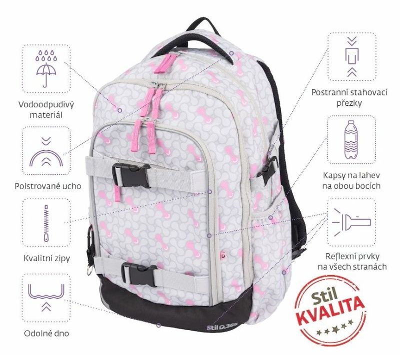 - bezpečnostné prvky na všetkých stranách batohu