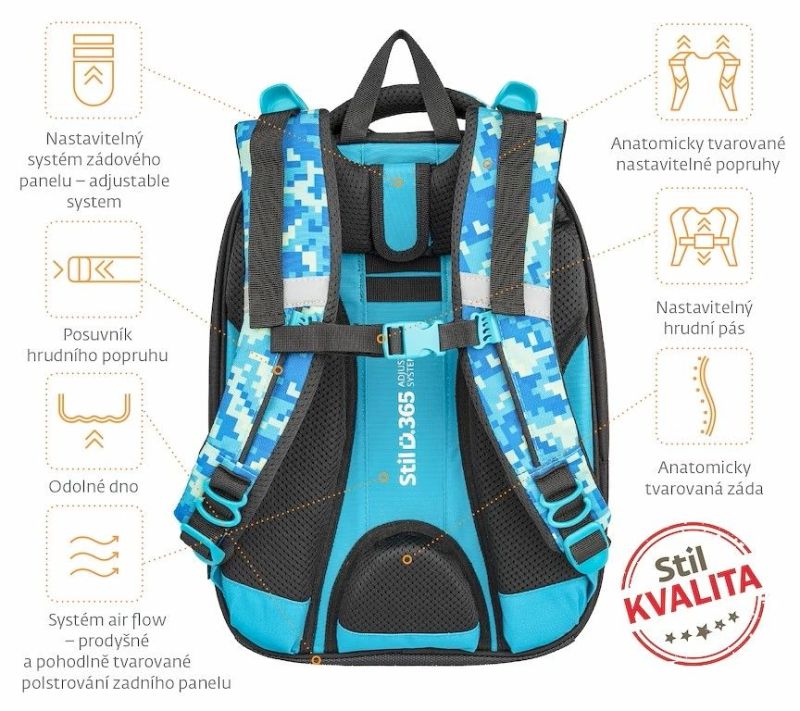 - kvalitný, ergonomicky tvarovaný, odľahčený školský batoh je vybavený reflexnými prvkami a anatomicky tvarovaným chrbtom s pevnou konštrukciou