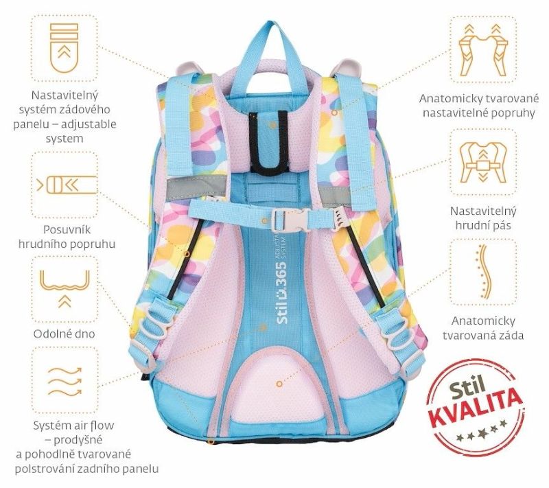 STIL ADJUSTABLE SYSTEM – nastaviteľný systém chrbta s tromi stupňami pre optimálne usadenie batohu na chrbte podľa výšky a veku dieťaťa. Batoh, ktorý rastie s dieťaťom