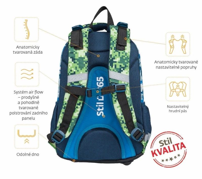 - kvalitný, veľmi ľahký, ergonomicky tvarovaný a odľahčený školský batoh je vybavený reflexnými prvkami a anatomicky tvarovaným chrbtom s pevnou konštrukciou