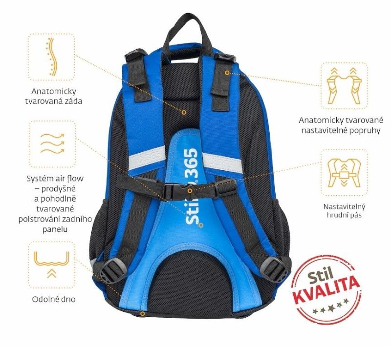 - kvalitný, veľmi ľahký, ergonomicky tvarovaný a odľahčený školský batoh je vybavený reflexnými prvkami a anatomicky tvarovaným chrbtom s pevnou konštrukciou